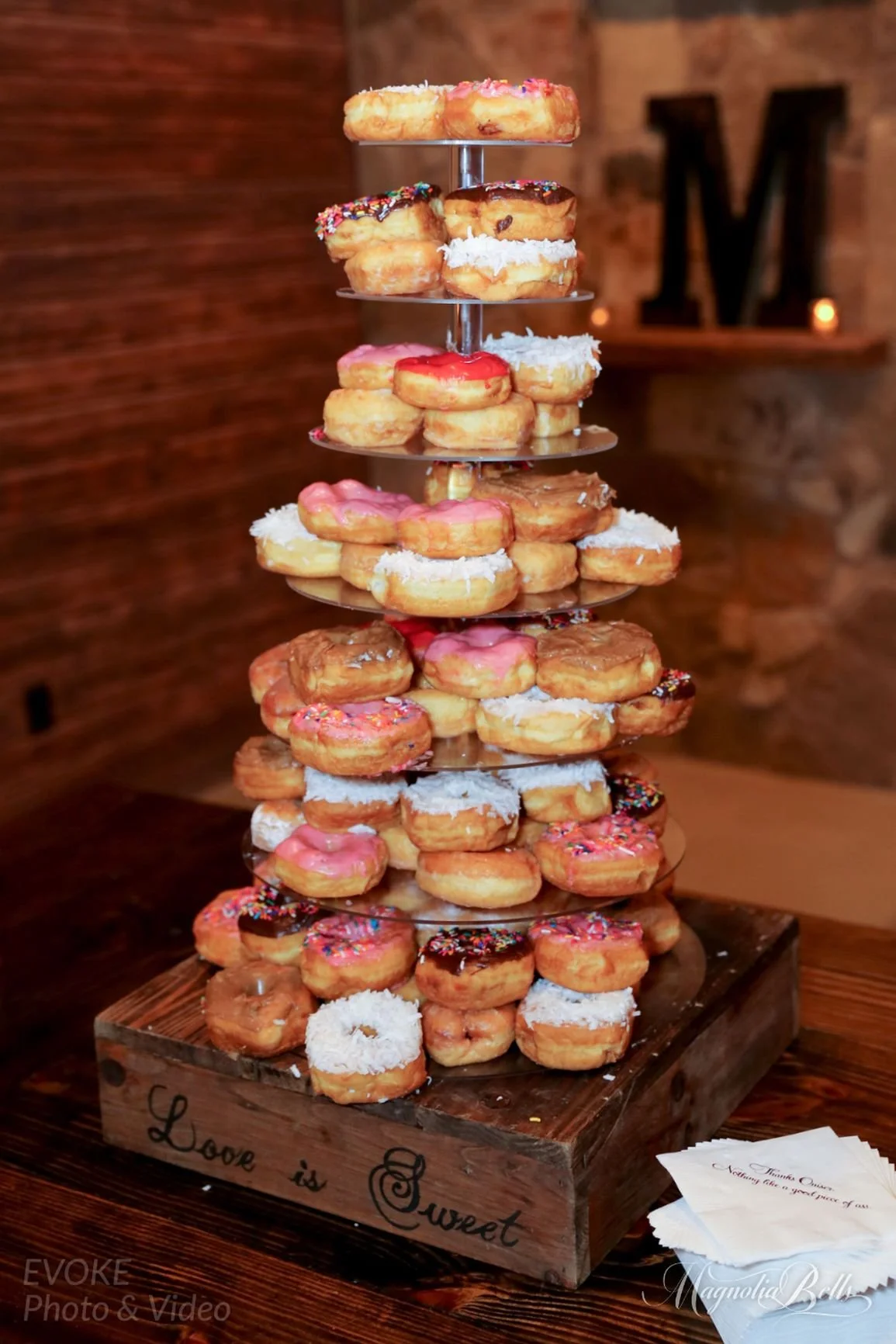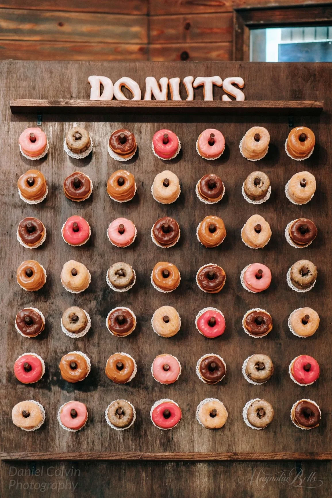 Donut displays are a fun, hands-on way to present your wedding dessert and have guests pick their own wedding treat right off the display. Just like many popular desserts, donuts offer so much variety. Donut icing can range to match your wedding colors, and flavors can range from plain to your personal favorite flavors, be that blueberry or chocolate sprinkled. Donuts as a wedding treat offer another fun personalization: they can be shaped into letters of your choosing, whether that’s your new last name or “Mr. and Mrs.” If you choose a donut wall as your specialty option through one of our wedding packages, our handmade wood donut wall rental matches our wood Barn venue to tie in perfectly with your wedding reception.