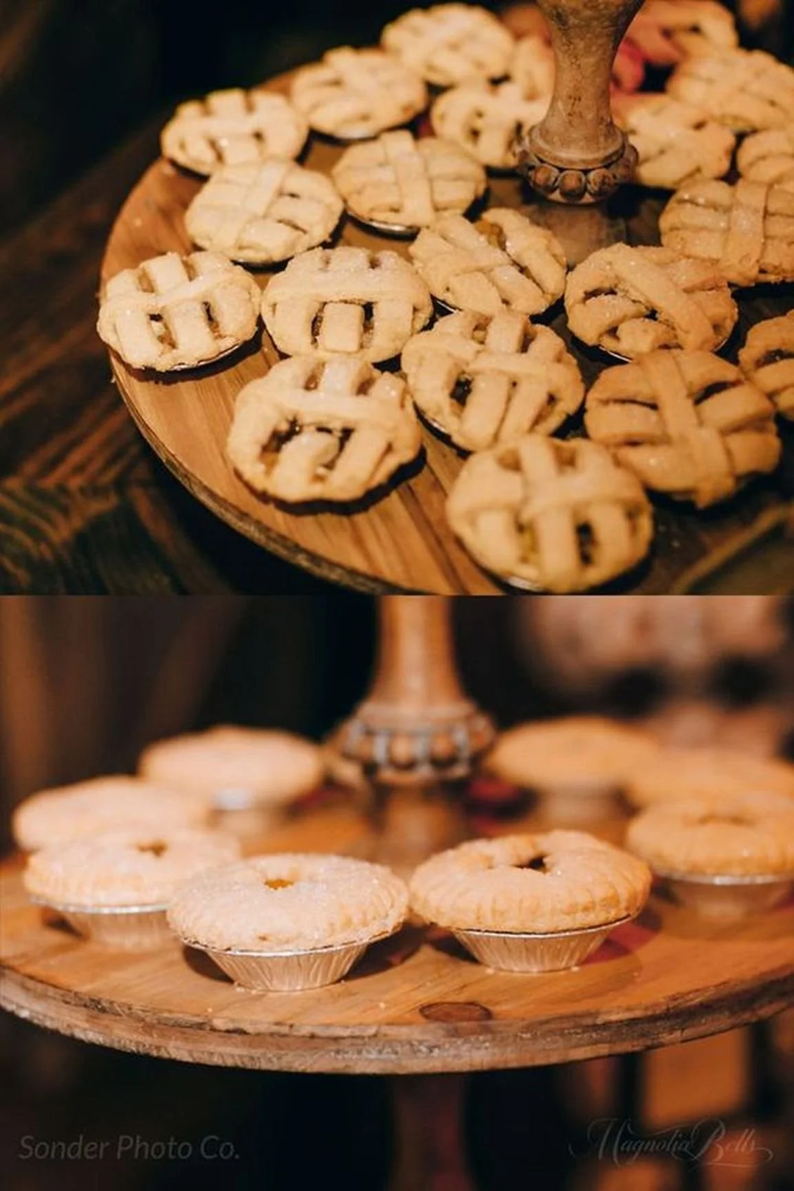 Pie at weddings is a sweet treat, whether replacing other dessert options or adding to the choices on your wedding day. Though not a traditional wedding cake, pies still offer the classic “cake” cutting moment as well to create unforgettable memories and photos. Pies offer so much variety in flavor and design, and can be a festive wedding dessert for holiday weddings especially. Our cake stand decor rentals at Magnolia Bells are also perfect for displaying pies, whether full-sized or bite-sized, for your guests to enjoy.
