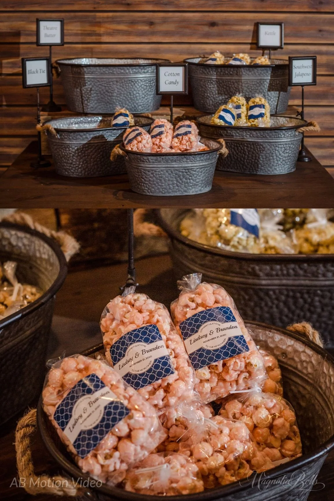 Whether you choose sweet or savory flavors (or both!), popcorn is a fun snack to mix into your treat options. Guests will enjoy snacking on popcorn throughout your wedding reception when they take a quick break from celebrating to recharge. At Magnolia Bells, our decor rentals include several large tubs, frames, and stands to display your favorite flavors of popcorn for guests to choose from. Popcorn is a tasty treat for your wedding day, and for guests to take home at the end of your wedding reception.